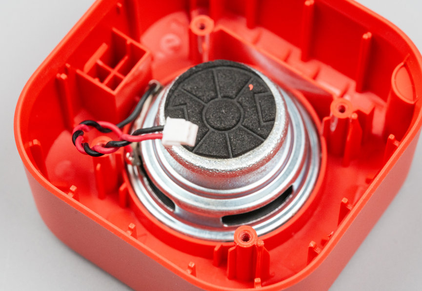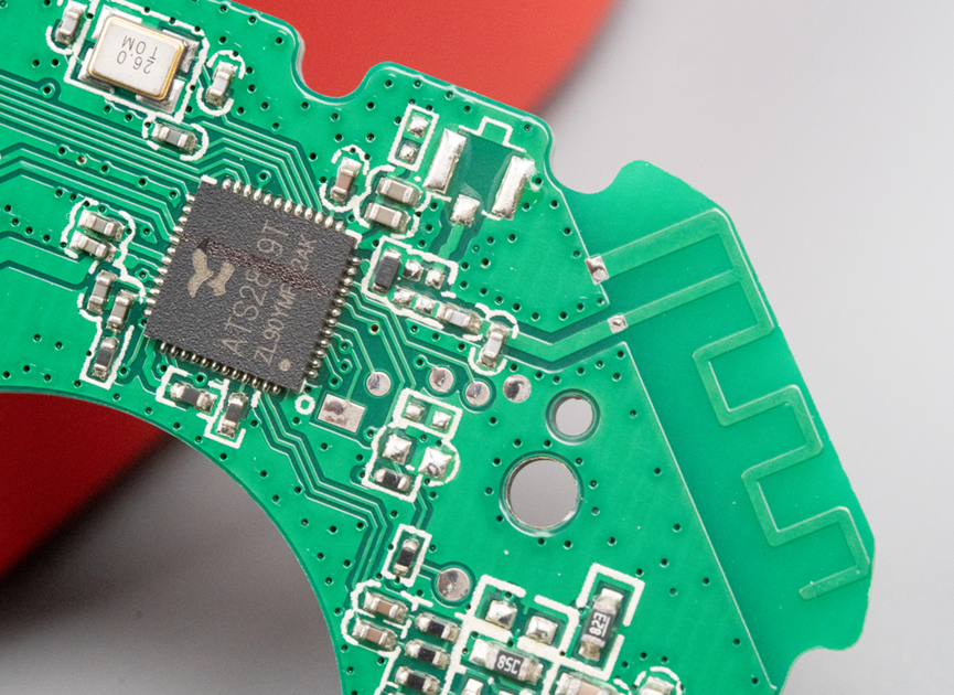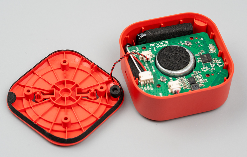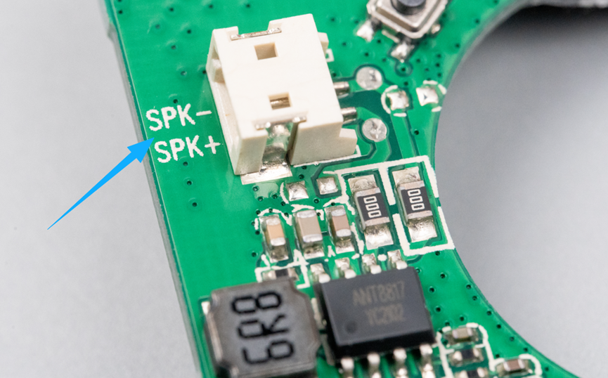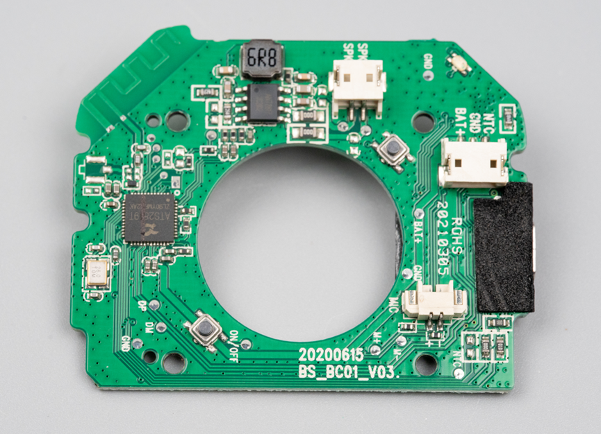 电路板中间镂空,左上角是蓝牙天线。扬声器、麦克风、电池都是通过连接器连接,没有直接焊线,看起来比较整洁。板子上的丝印是BS_BC01_V03,看来这个板子工程师总共打了三次样才定稿。
