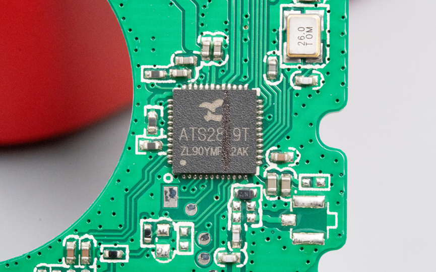 很显然这个是这个蓝牙音箱的主芯片,来自珠海乐侠的ATS2819T,是一颗高集成度的蓝牙5.0音频芯片,同时也可以用作智能语音助手,并且兼容百度DMA、阿里GMA、小爱同学等多家协议。这个芯片搭配了26MHz的晶振。