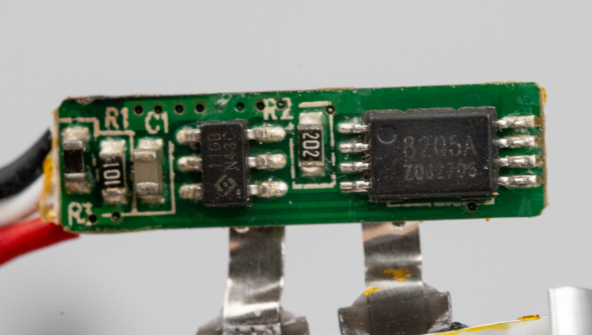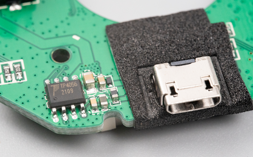 锂电池充电芯片TP4056。右边是Micro-USB连接器。