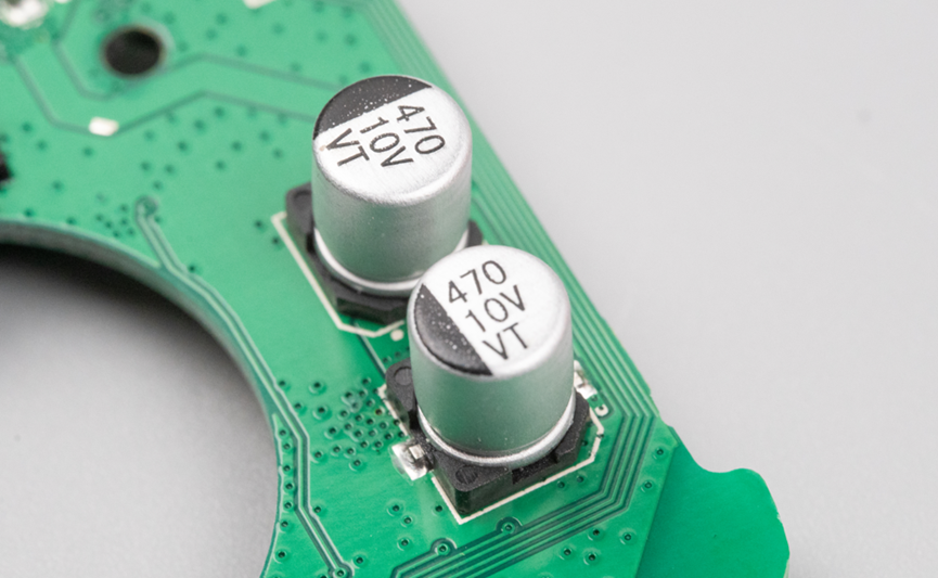 两颗470Uf10V的铝电解电容,放置在升压音频功放芯片的背面。