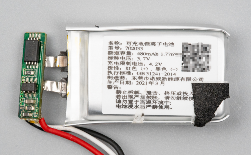 给脱了貂之后,看看锂电池的容量是480mAh,生产日期是2021年3月。