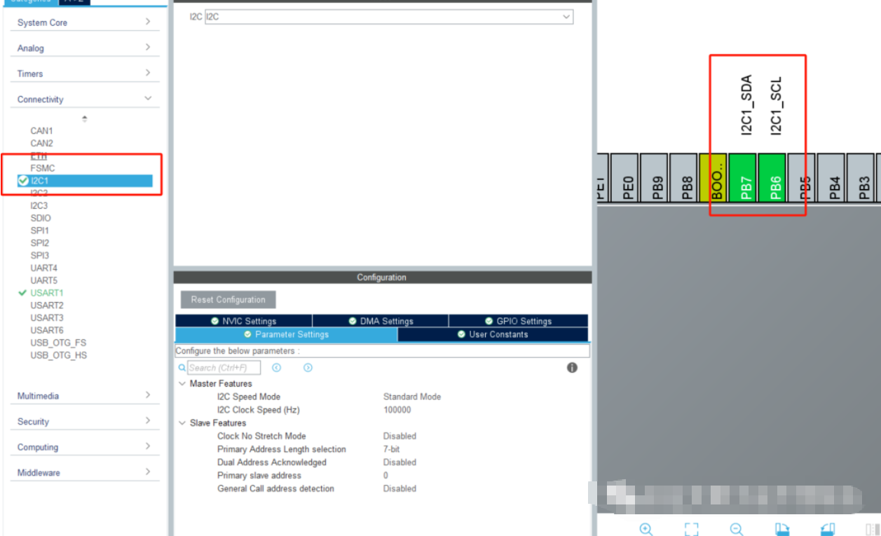 并且我们打开串口来进行调试,我们选择IIC1,可以发现是PB6/PB7。
