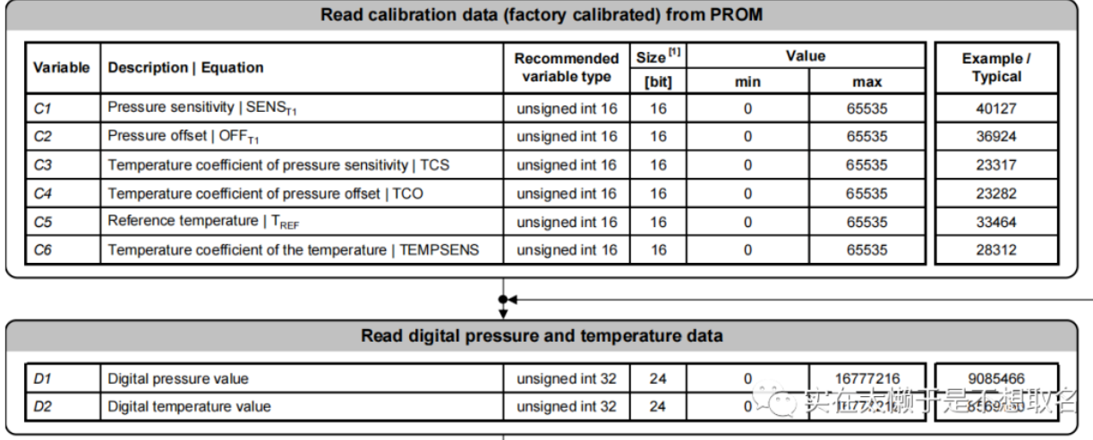 我们在MS5611的官方手册中可以看到,MS5611的数据主要由C1~C6这六个校准系数以及D1,D2两个数据组成。