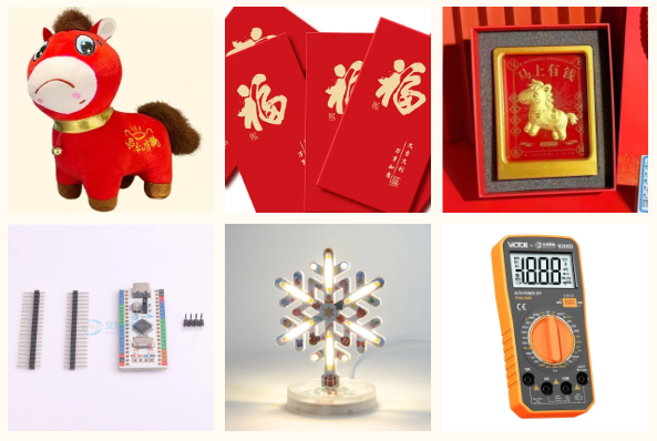万用表、开发板、元器件福袋、雪花灯等实用好物免费送!