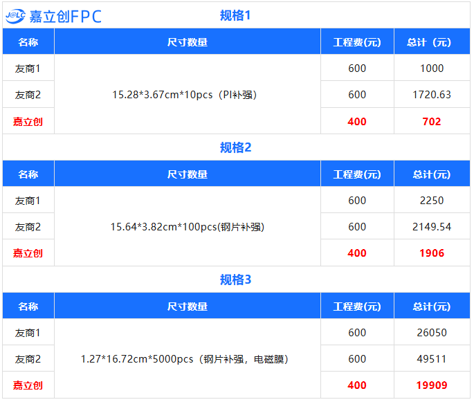 通过与2家友商的价格对比发现:嘉立创FPC四层板在工程费和总价上均占优势,相同规格下定制成本可直降30%-50%。相同资料报价情况如下: