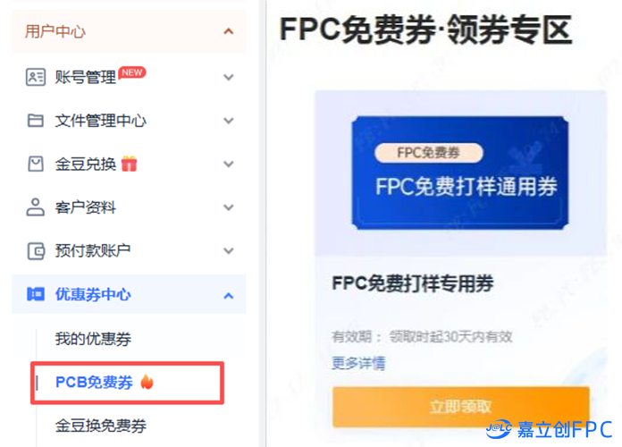 1、进入嘉立创FPC官网活动页:https://www.jlc-fpc.com/promotional,即可领取;