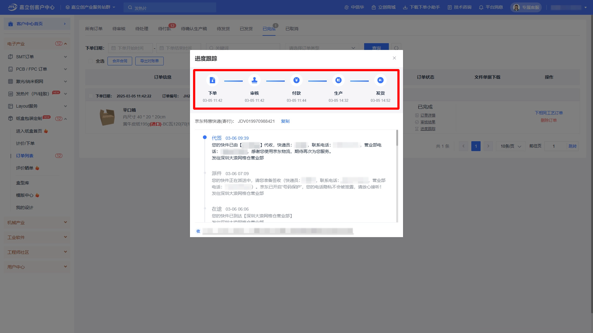 2. 找到栏目【电子产业】—【纸盒包装定制】,点击【订单列表】,即可查看所有订单的产品、价格、生产稿进度、交期等信息。