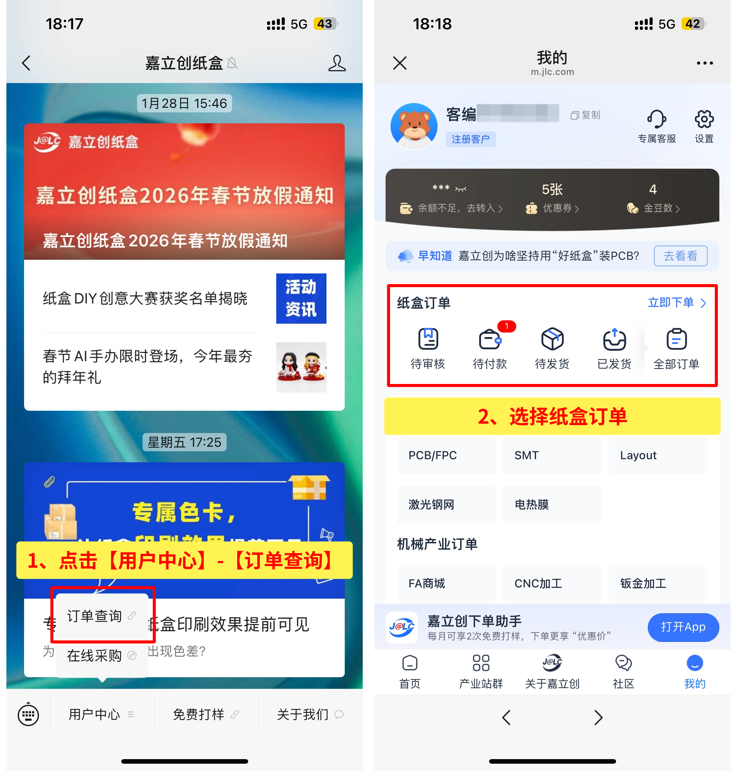 1. 关注【嘉立创纸盒】微信公众号,进入底部菜单栏。选择【用户中心】—【订单查询】,即可查看订单详情与物流动态。