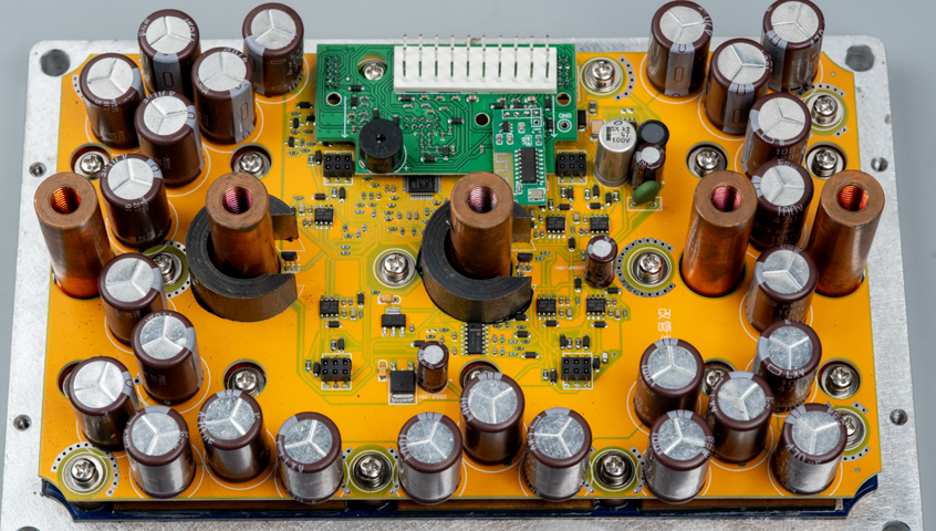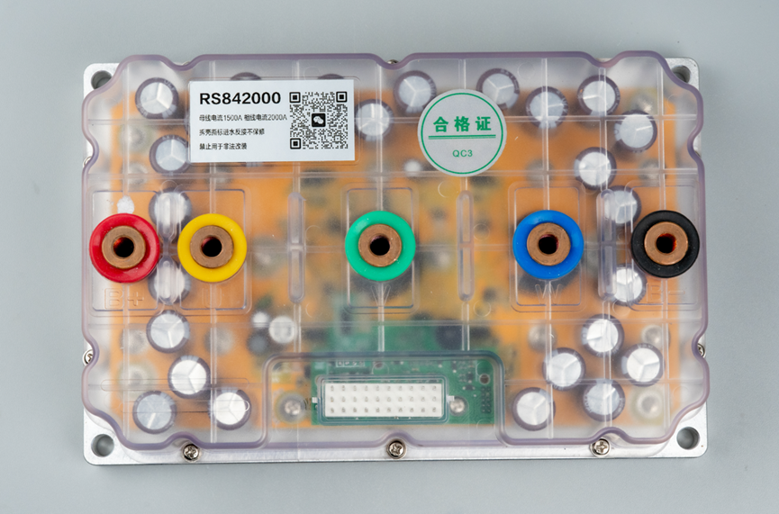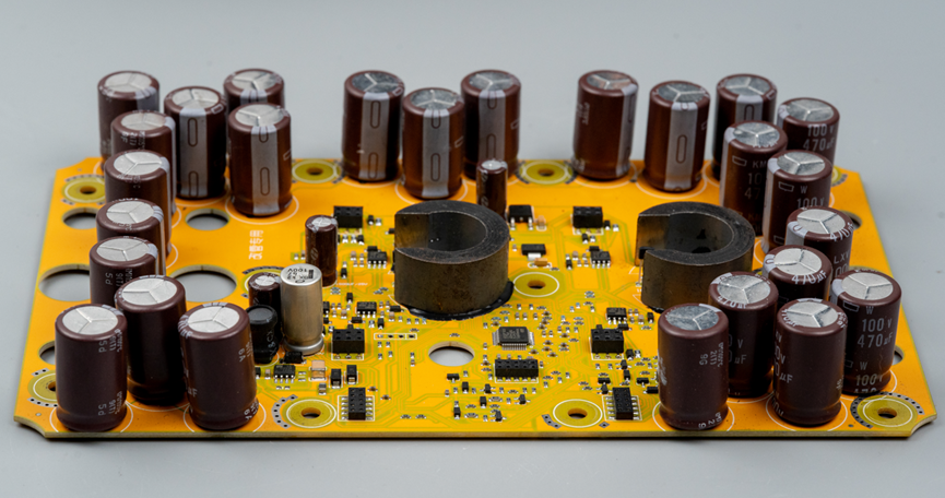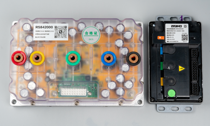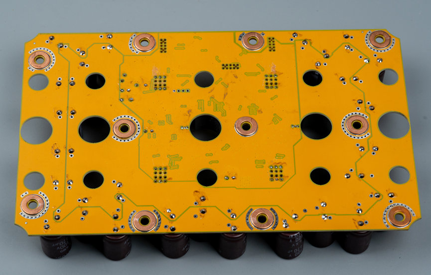 拆掉顶壳之后,第一眼就被圈粉了。上面这个黄色的板子看起来是控制板,控制器芯片和MOS预驱、电流采样等电路都放在这个板子中间区域,看起来布局不是很紧凑对吧,那是因为板子太大了,哈哈。周围的区域放的全是电解电容。电机两个相线柱子外面加了磁环,用来配合进行相电流采样。