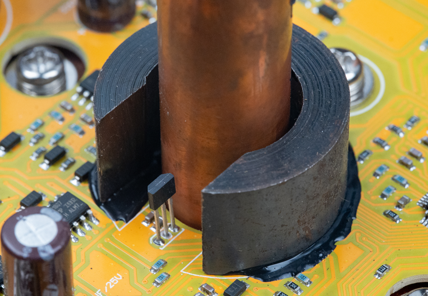 这是电机相线柱和磁环、霍尔传感器的安装方式。旁边还有几颗蓝色的高精度电阻。