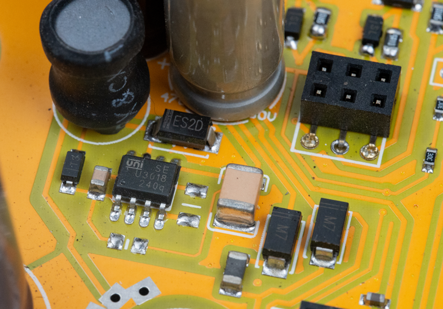 这颗U3018是来自宇力半导体的DC-DC电源芯片。它的输入电压最高可以到180V,这可以很好的避免刹车或者下坡时产生的反向电动势击穿DC-DC芯片。