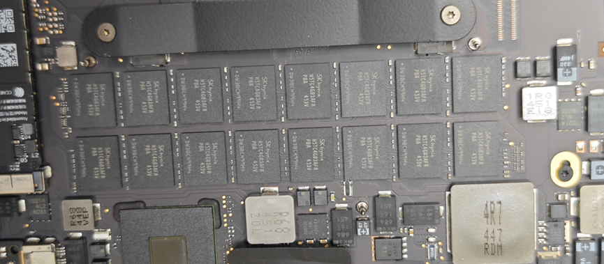 这做工,看着是真舒服,电池没有任何鼓包的迹象,主板中间的两排海力士内存颗粒非常显眼,给个特写。