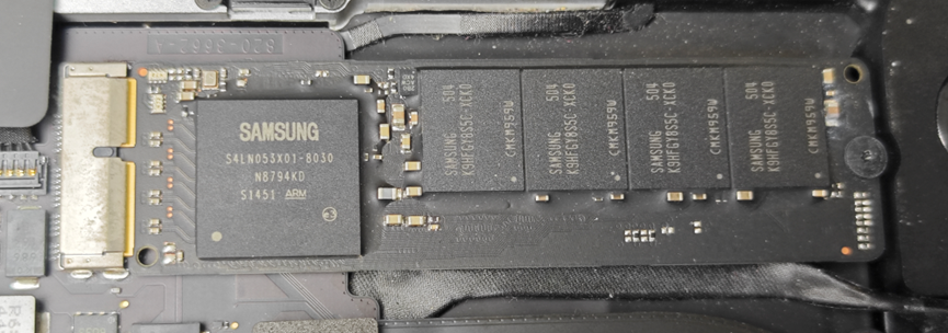 硬盘是三星的主控加三星的存储颗粒。看起来右端的电容处有点腐蚀的痕迹。