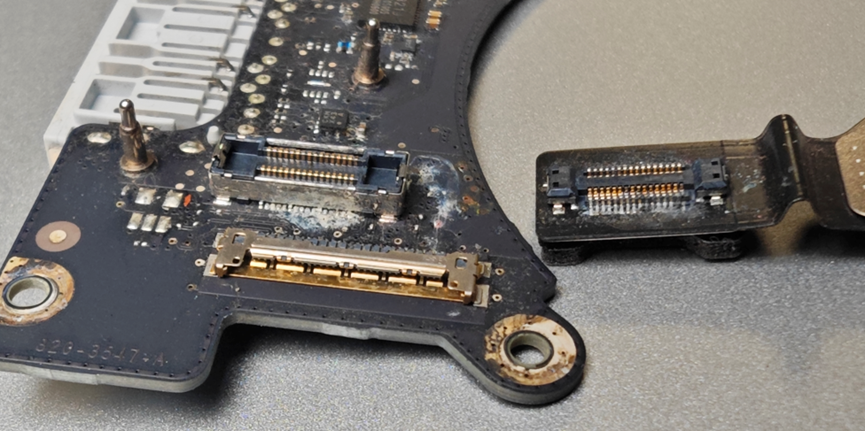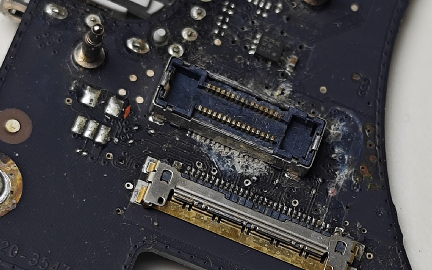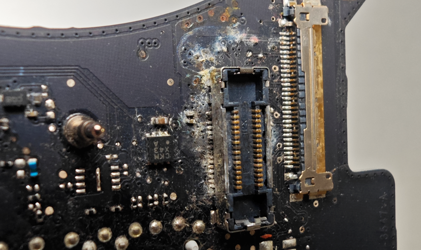 拿掉这个板子上的两个排线之后,发现连接器处有水渍和烧毁的痕迹。而且相当严重,螺丝孔的焊盘上也已经生锈,看来进水之后,由于键盘下面有一层防水膜,所以水从边上流下来,祸及这个小板子了。