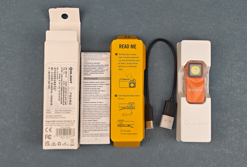 打开包装,里面有产品多国语言的说明书,使用说明卡,充电线,还有Oclip本尊。