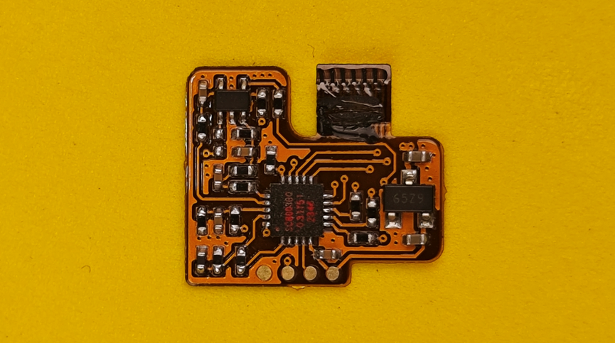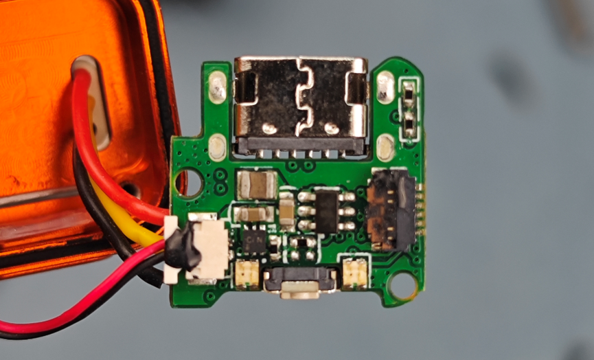 另一个PFC板子,可以理解为控制板,上面主要的器件就是中间这个QFN-20封装的MCU,具体型号没有查到,但是看走线,几乎所有的引脚都用到了。这也是第一次在手电筒里见到FPC软板,为了把尺寸做小,也挺不容易啊。