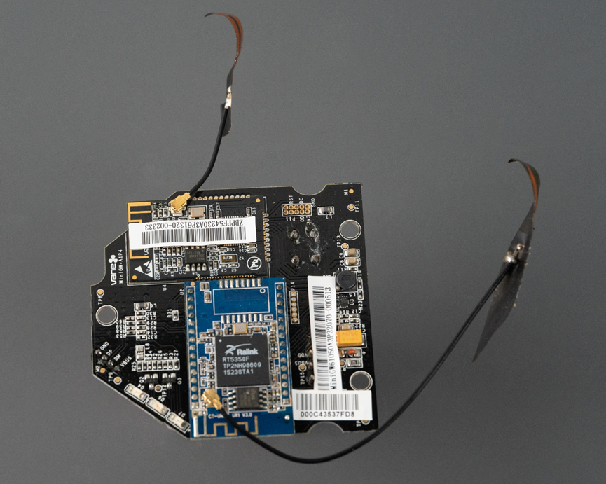 其中一个无线模块上的芯片是来自Ralink公司2010年推出的RT5350F,这是一颗单芯片802.11n 1x1 MIMO WLAN SoC。内部集成了基带处理器、射频、射频功放、一颗高性能的MIPS 24Kc CPU内核(最高主频360MHz)。下面的SOP-8封装的EN25QH64A-104HIP是一颗64Mb的Nor Flash。像上面的模块那样,只需要很少的外围器件,就可以组成一个完整的低成本2.4GHz无线网。