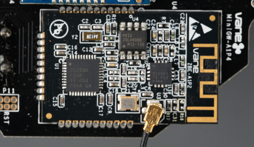 另一个无线模块上的主芯片是CC2530。这是TI的一颗具有256kB闪存和8kB RAM的Zigbee和IEEE 802.15.4无线MCU。SOP-8封装的器件是旺宏电子的MX25L4006E,这是一颗4Mb的NOR Flash。另外一颗QFN-16封装的器件是CC2591,来自TI的2.4GHz射频前端芯片。