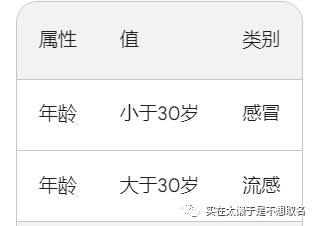该数据集共有两种属性:年龄和类别。年龄有两个值:小于30岁和大于30岁。类别有两种值:感冒和流感。