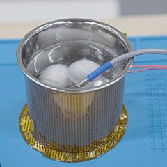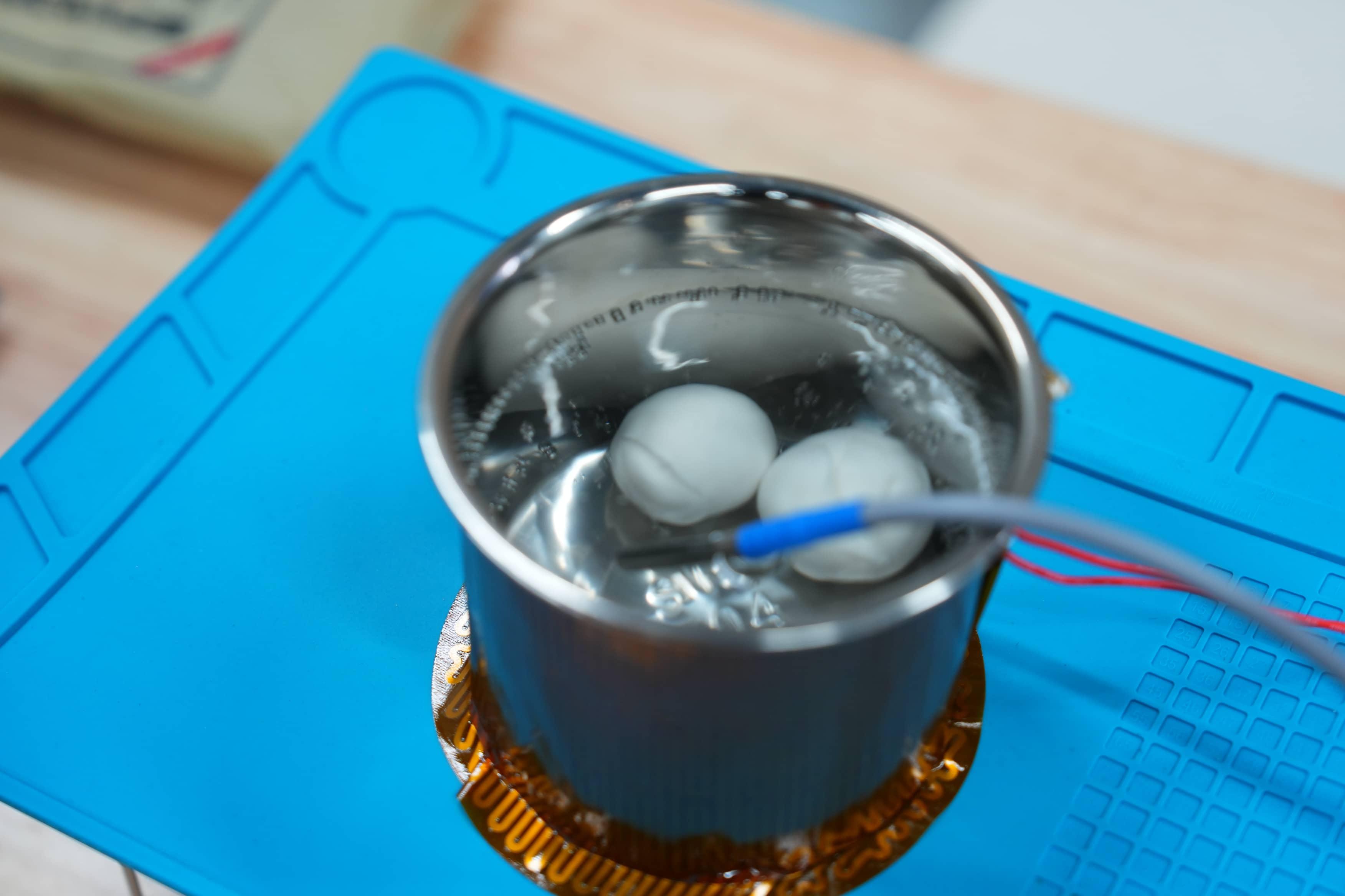 可以看到随着发热片的持续加热升温,缸体中的清水在持续升温。5分钟之后,水体达到沸腾温度,随后放入冰冻汤圆,搅动水体,等待水体再次沸腾,汤圆微微漂浮起来,我们的汤圆就煮熟啦。