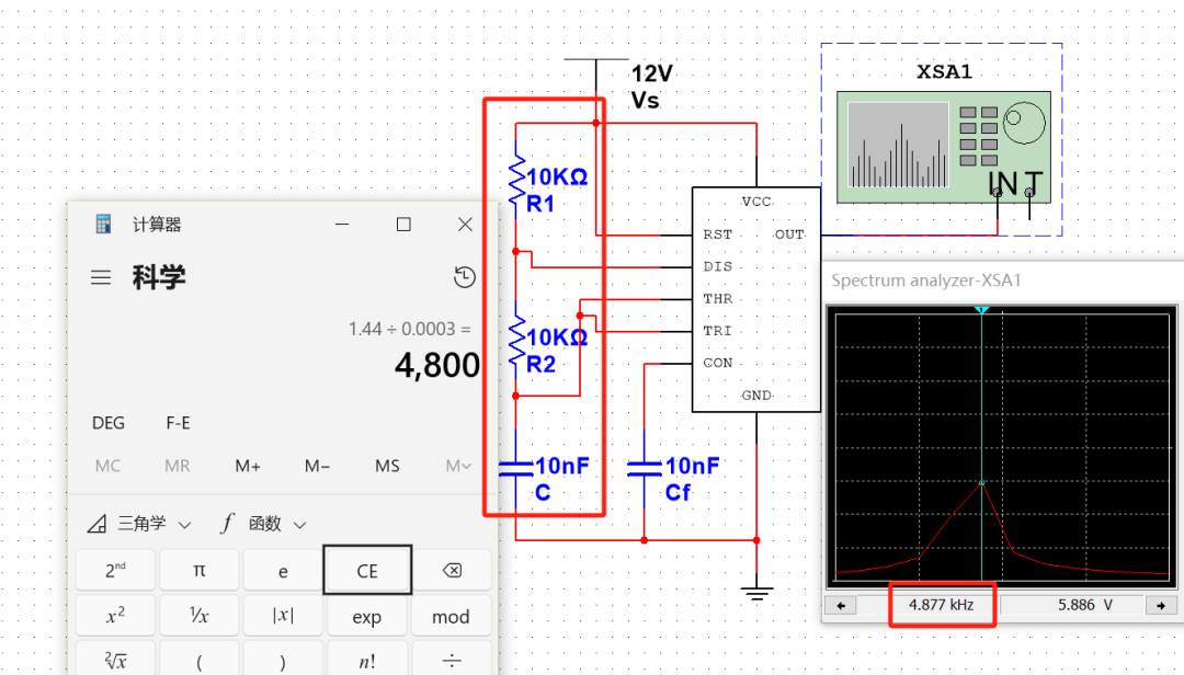 我们利用Multisim进行仿真,可以看到理论频率为4800HZ,我们利用频谱分析仪测出的频率则是在4877HZ,1.6%的误差(应该可以纠正, 而且是频谱分析仪,而且是仿真。)