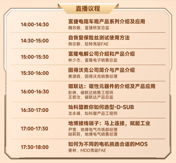 4小时直播,8家优质电子原厂面对面交流,覆盖电阻、保险丝、电解电容、磁性元器件、连接器、接线端子、MOS管等核心品类,助力电子人马年研发、学习一路开挂。