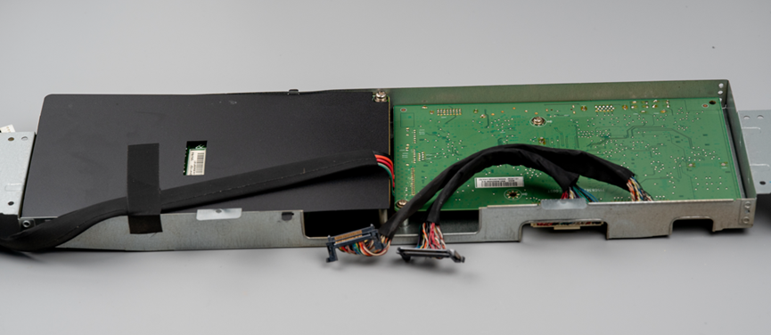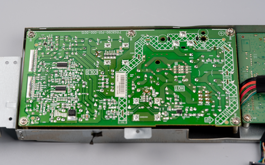 其中主板和电源板在同一个钣金外壳里,左边的是电源板,上面有麦拉片进行绝缘保护。