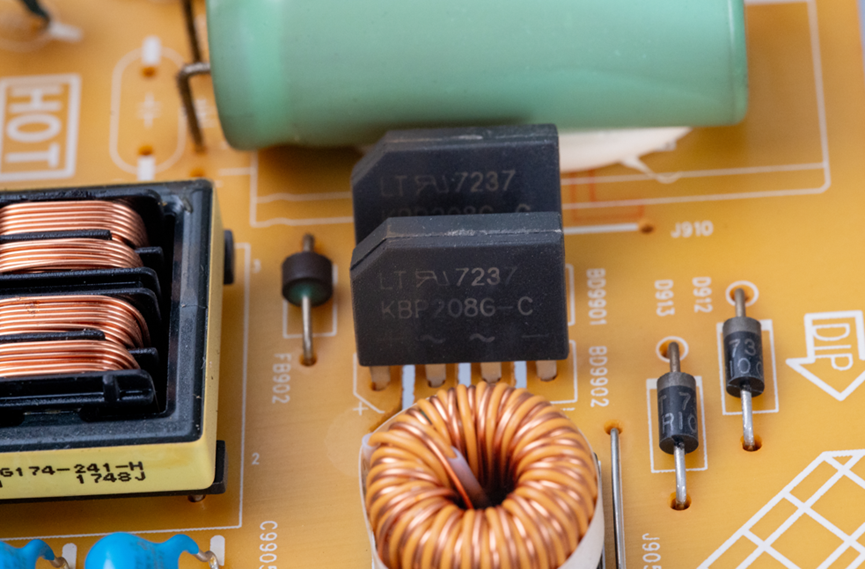 从电源接口进来之后,经过了保险丝、X电容、共模滤波电感等等,最后进入了两个并联的整流桥。