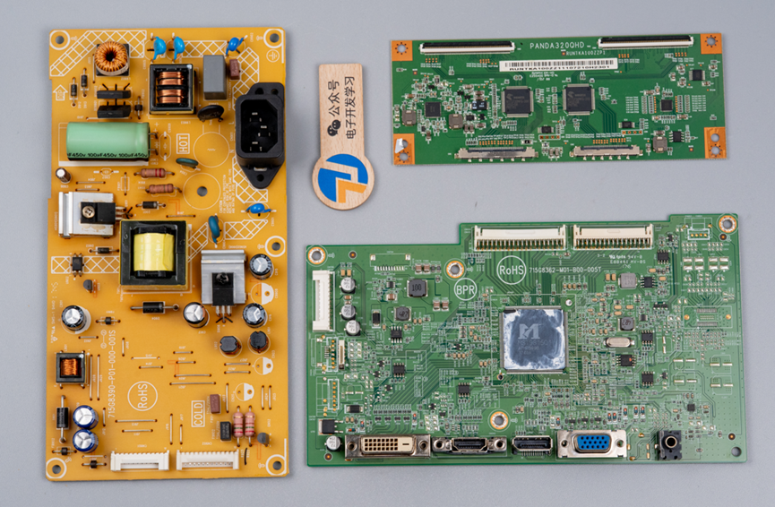 整个显示器里总共有三块电路板,分别是电源板、主板、逻辑板。