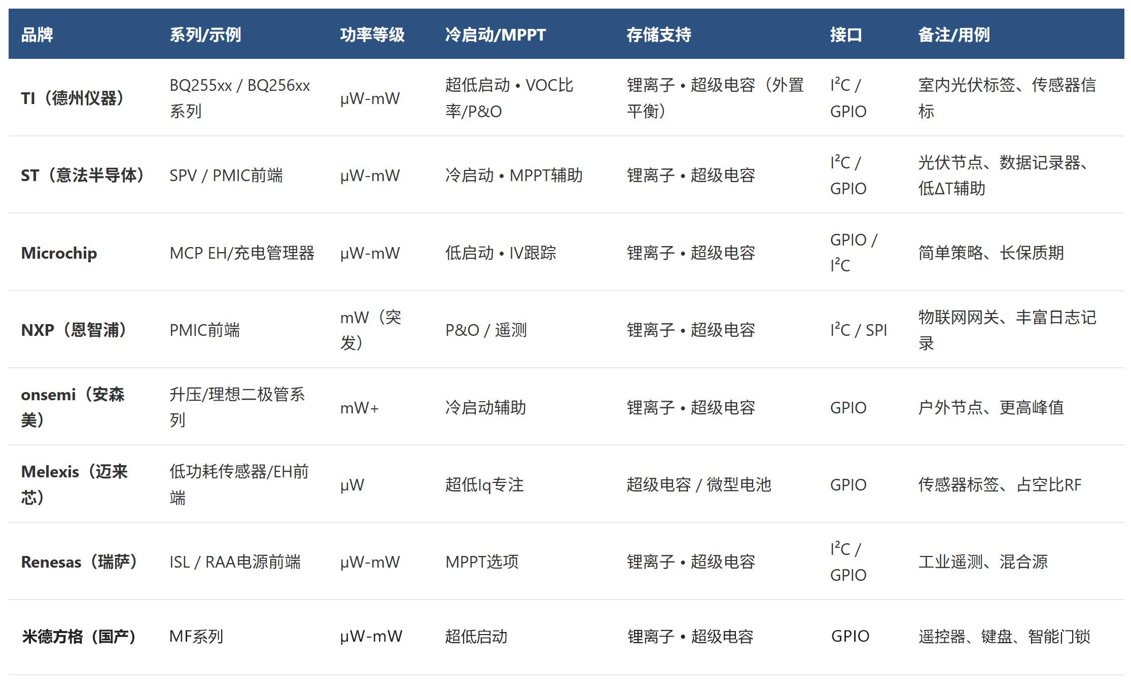 能量收集PMIC(电源管理集成电路)是一种专门用于从环境能量源(如光、热、振动等)捕获微弱能量的芯片。其核心工作流程包括:从微小输入实现冷启动,通过MPPT(最大功率点跟踪)或IV曲线跟踪寻找最佳工作点,进行功率转换与调节,最终为储能元件(电池或超级电容)充电,或直接为低功耗负载供电。典型应用场景涵盖可穿戴设备、远程传感器、资产追踪器和户外物联网节点。