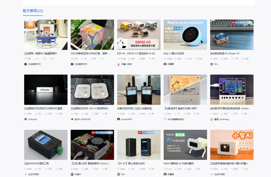 1.直达立创面板优质工程合集:https://oshwhub.com/recommend/szlcmb,查看优质作品详细设计、开源文件,找灵感、学设计、复刻佳作;
