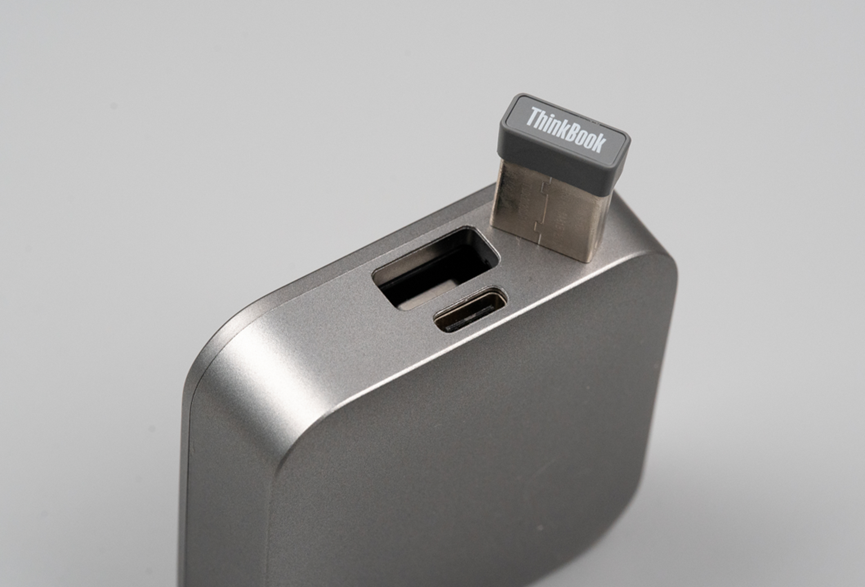 充电口是Type-C接口,旁边还有一个收纳USB无线收发器的收纳仓。这个USB无线收发器也是这个耳机的亮点,既可以通过蓝牙连接手机使用,也可以通过这个USB无线收发器连接电脑使用。