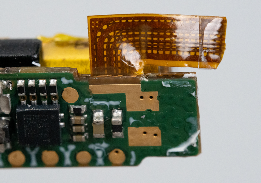 PCB采用了软硬结合板的工艺,引出的FPC排线连接到了充电触点。