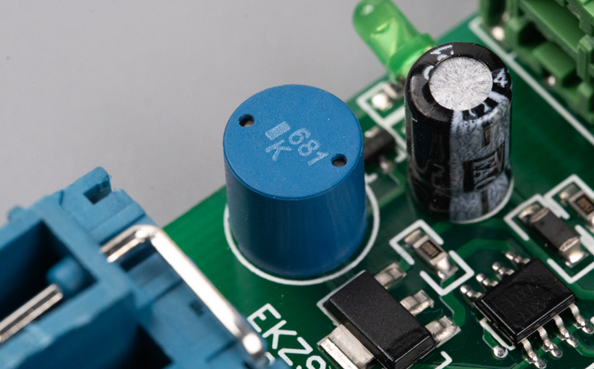 我在这个板子上看到了一些平时比较少见的器件,比如这个蓝色的圆柱形的器件,是一个直插圆柱功率电感,681代表电感值为680uH。