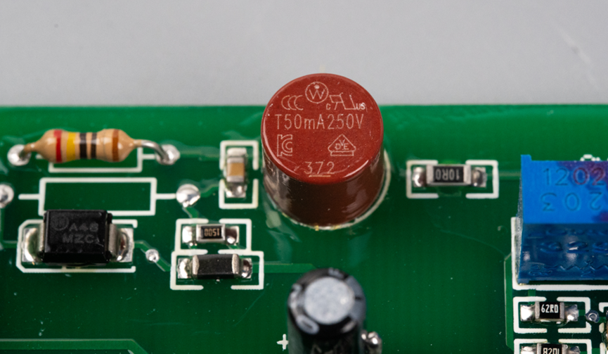 这里有一个很奇怪的玩意,四个二极管在这里构成了一个本安屏障。他们组成了一个齐纳二极管阵列,搭配旁边的蓝色大功率色环电阻,实现安全限压作用。当电路出现过压时,这个齐纳二极管阵列快速导通,将电压钳位到安全值以下,放置高压窜入危险区。