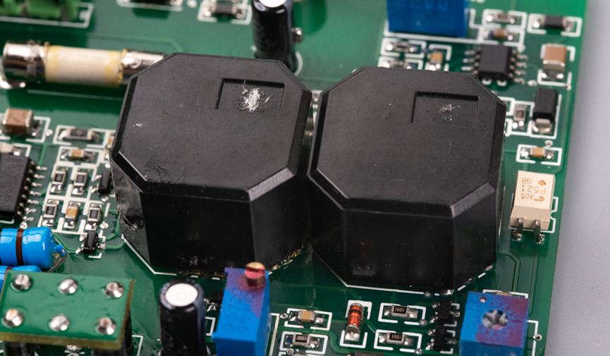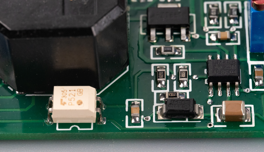 从板子背面看,两个黑墩墩的引脚数是不一样的。其中6脚的黑墩墩是一个信号隔离变压器。初级信号来自运放TL081的输出,次级为安全区信号。另一个15脚的黑墩墩是一个多绕组的变压器,实现主信号隔离、电源隔离等等。