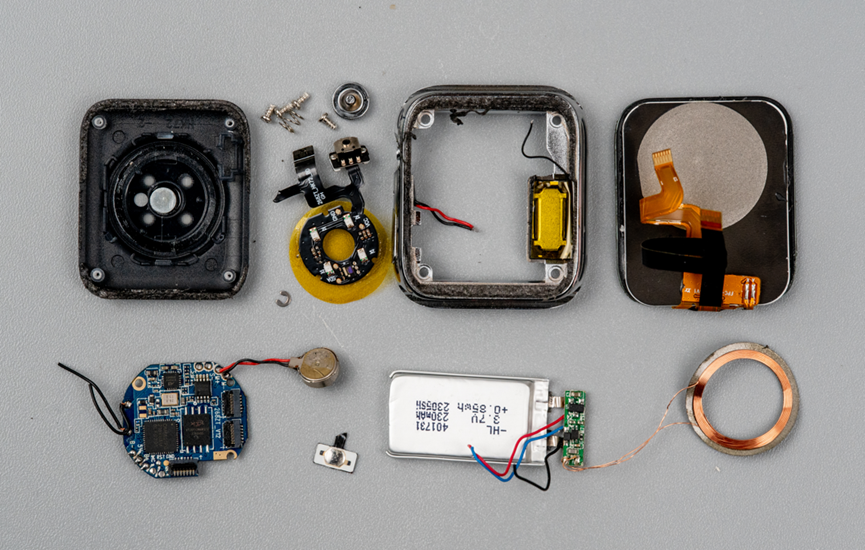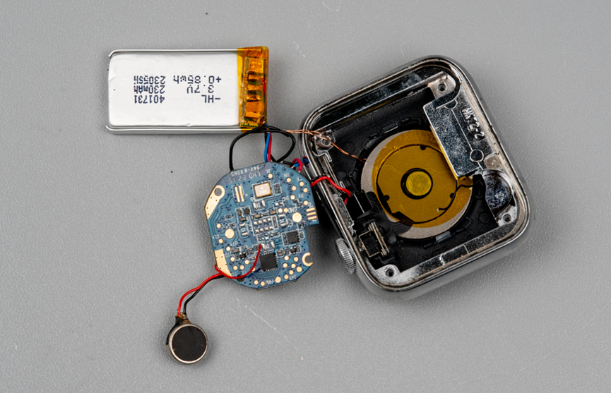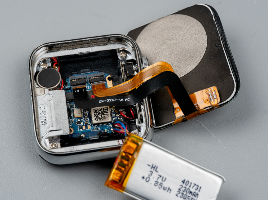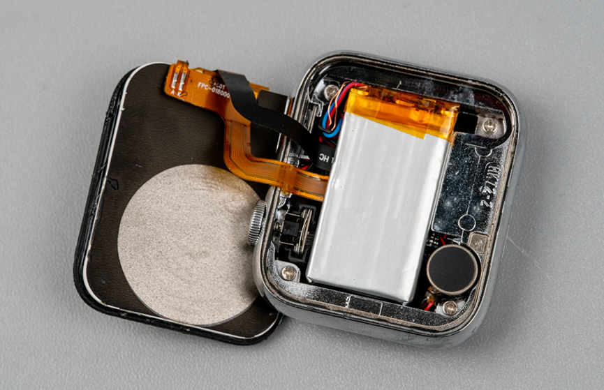 拆解这种表盘,一般是给屏幕加热,然后用吸盘吸开就可以了。这个手表里用的电池够大。
