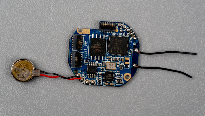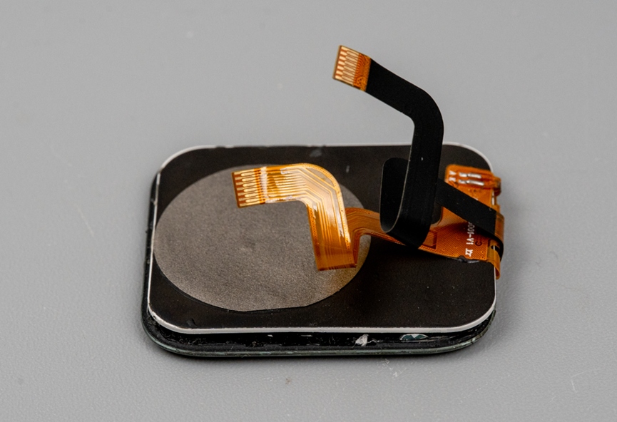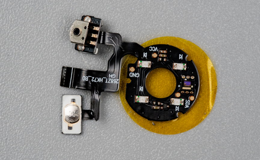 继续拆解,下面是一个FPC板,这个板子上面焊接了四个贴片LED灯以及一个心率传感器,另外引出两个分支,上面分别焊接了锅仔片按键和旋转编码器。所有信号汇总之后通过FPC排线座接入主板。