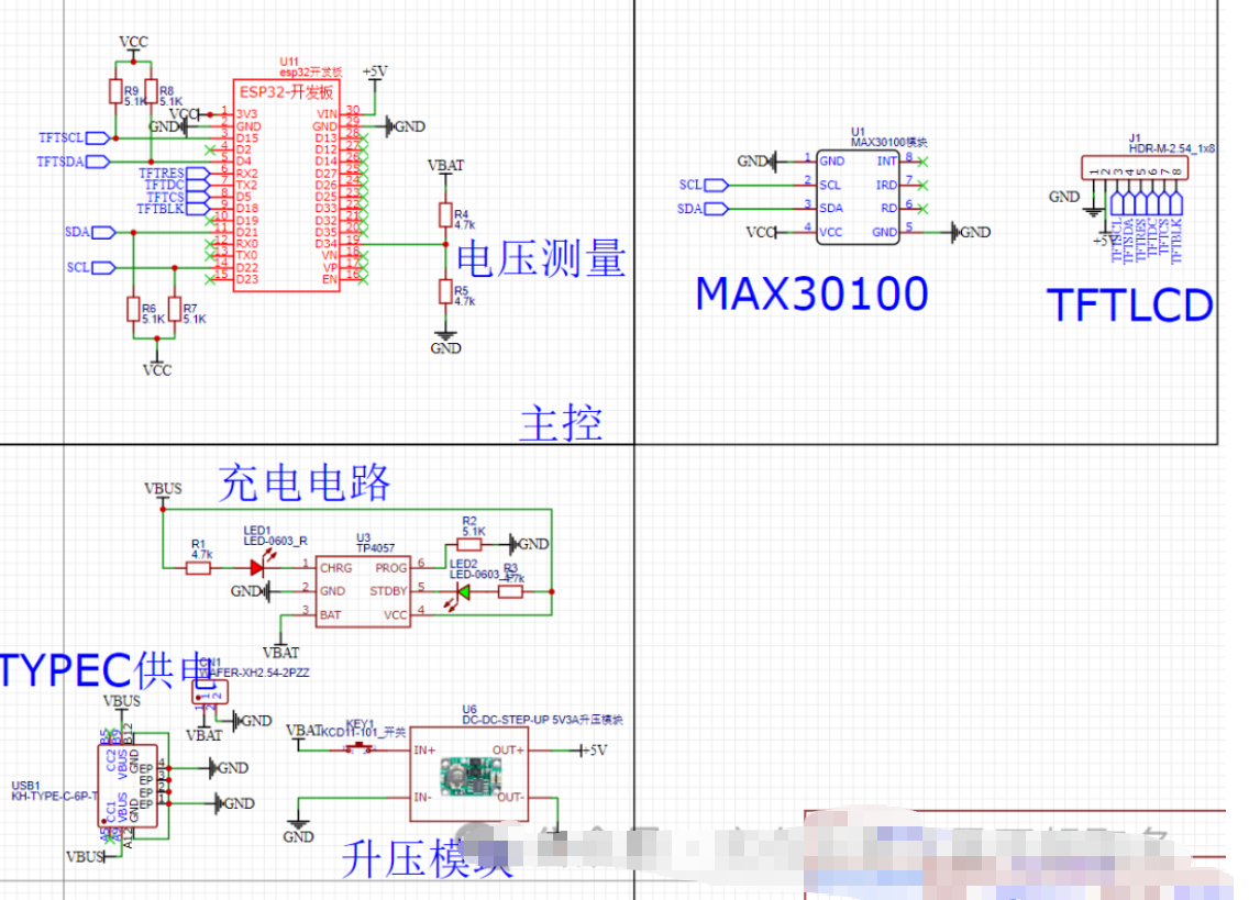 我的目的是:锂电池供电(锂电池充放电路),锂电池升压电路(3.7V转5V),ESP32主控可以远程上传数据,MAX30100模块测量血氧,1.54寸OLED显示。