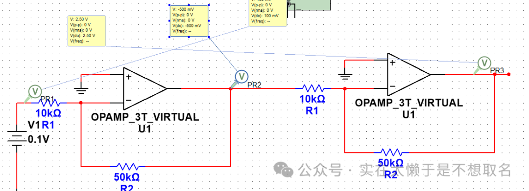 我们也可以使用比例运算放大器的级联放大的方式(因为不推荐单独一个运放放大太大的倍数)实现放大几十/百倍的需求。