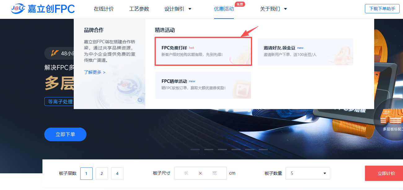 1️⃣打开嘉立创FPC官网,在首页导航栏中点击进入活动页:https://www.jlc-fpc.com/promotional