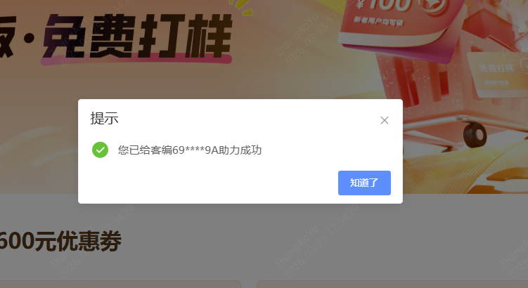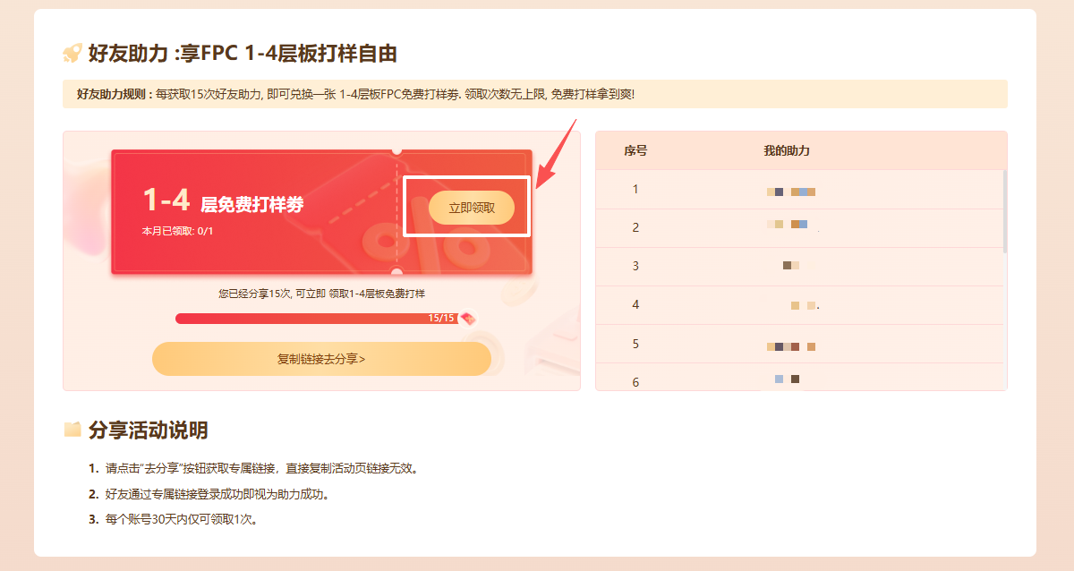 4️⃣助力目标达成后, 即可在活动页面手动领取一张1-4层板FPC免费打样劵。