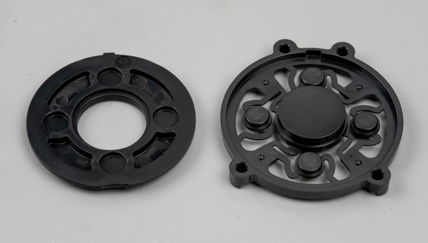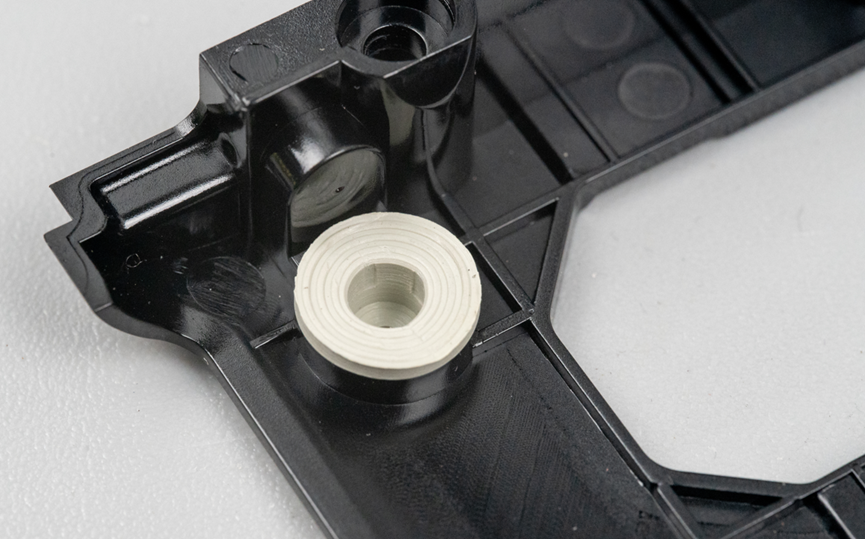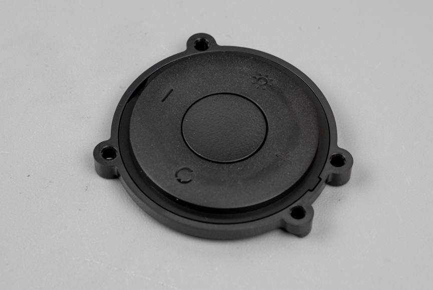 拆掉这一面的黑色塑料盖板上的螺丝。我发现这个充气宝里用了几个白色的橡胶材质的防震垫片,主要安装在电机周围,这可以有效降低电机震感传递到用户手上。