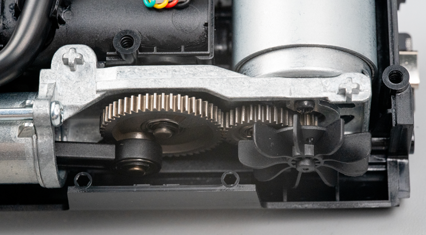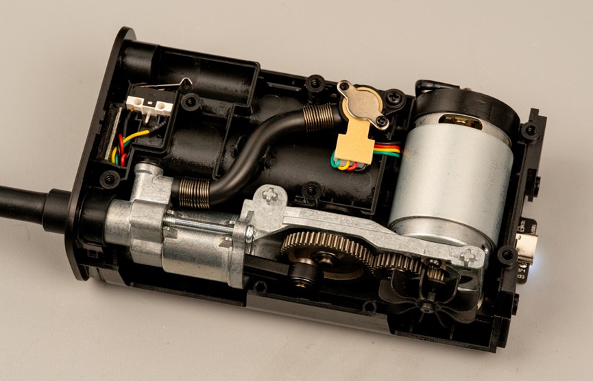至此,这个充气宝的构造就看得很明白了。一个直流电机,通过几个减速齿轮,带动插在气缸里的活塞不断吸气和压缩,从而把空气从气管泵出去。