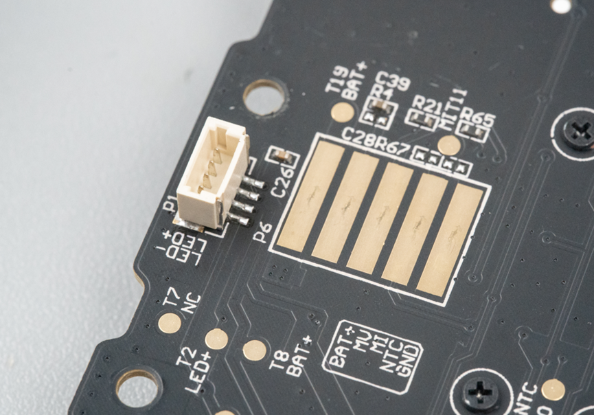 接下来拆掉另一面的电路板,电路板背面通过几个焊盘和底部的电池保护板上的弹簧触点连接。