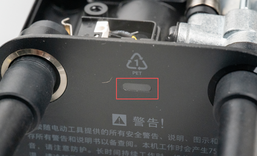 开始研究拆解换电池。观摩了一圈,想要拆解应该先把这个盖板给拿掉,这里可以用一个比较细的钩子插进孔里勾出来即可,我掏出随身携带的工具,插进孔里很快就完成了这个盖板的拆解。
