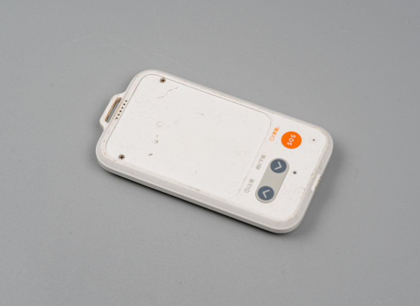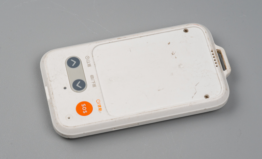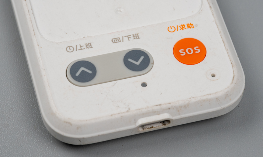 底部有三个按键,分别是上班按键、下班按键、SOS求助按键。下班按键底下还有一个指示灯。右下角似乎有一个麦克风拾音孔。