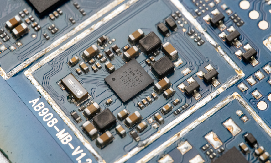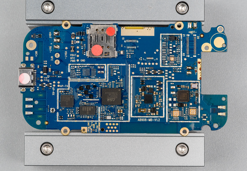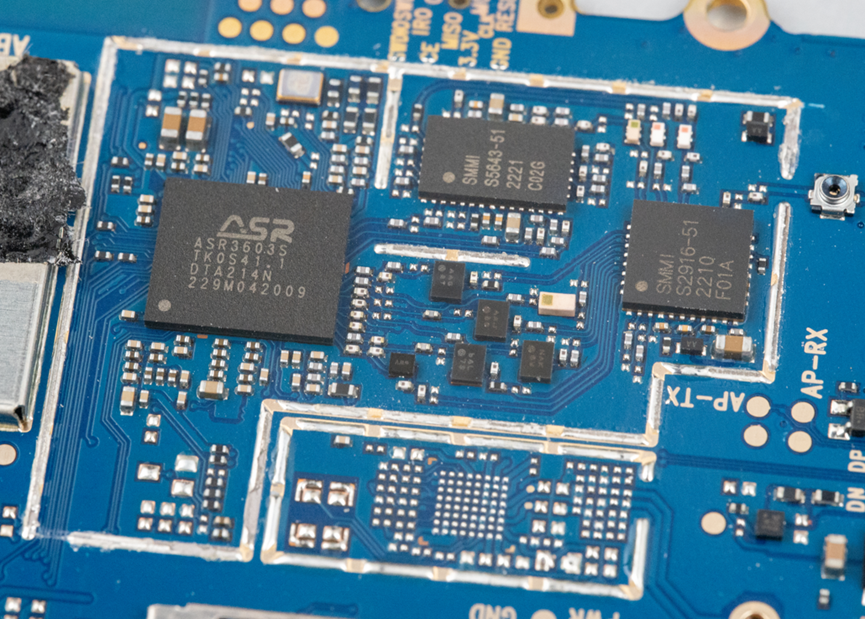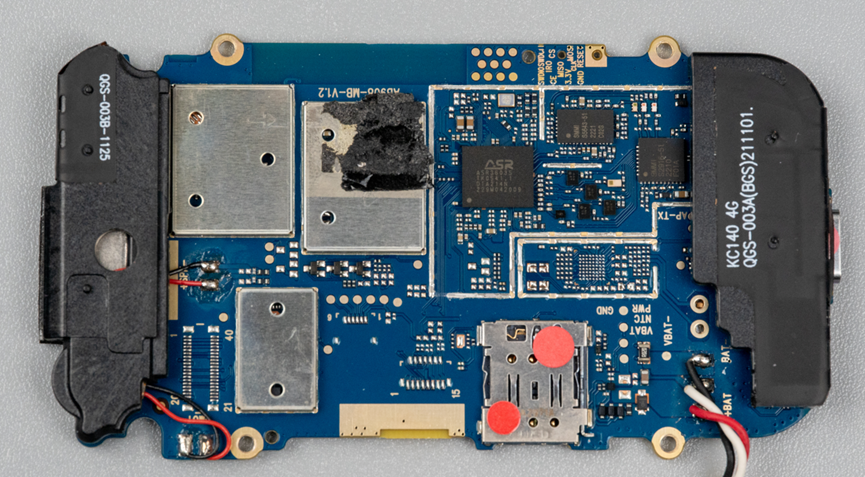 没有加屏蔽壳这里,用了一个ASR3603S,这是一个用于可穿戴产品和功能机产品的Cat.1芯片,支持从450MHz到2.7GHz的所有频段,支持Thread X和AliOS操作系统,其中AliOS上完成了支付宝预集成。还集成Audio/Video Codec、LCD、Camera等多媒体功能。另外,它支持VoLTE语音通话,还支持双卡双待。单芯片可以实现LTE Cat.1 / WCDMA / GSM这几种制式。所以可以使用的场景比较多,比如4G智能穿戴、学生卡、网络摄像头、POS机、云喇叭支付、功能机等等。