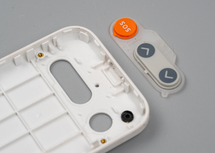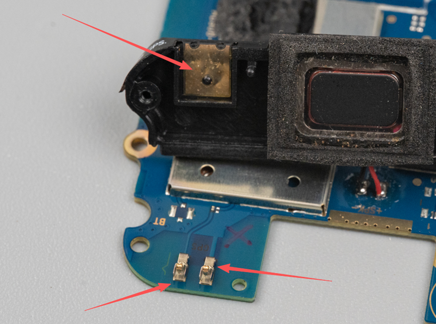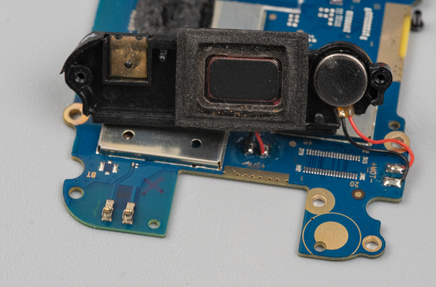 其中顶部这个黑色塑料配件下面除了天线触点,还有扬声器和震动马达。