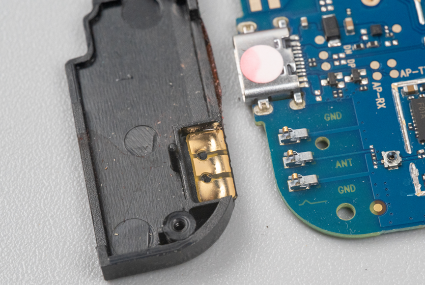 另一端的黑色塑料件下面,电路板上是Type-C插座和另一个天线弹片。